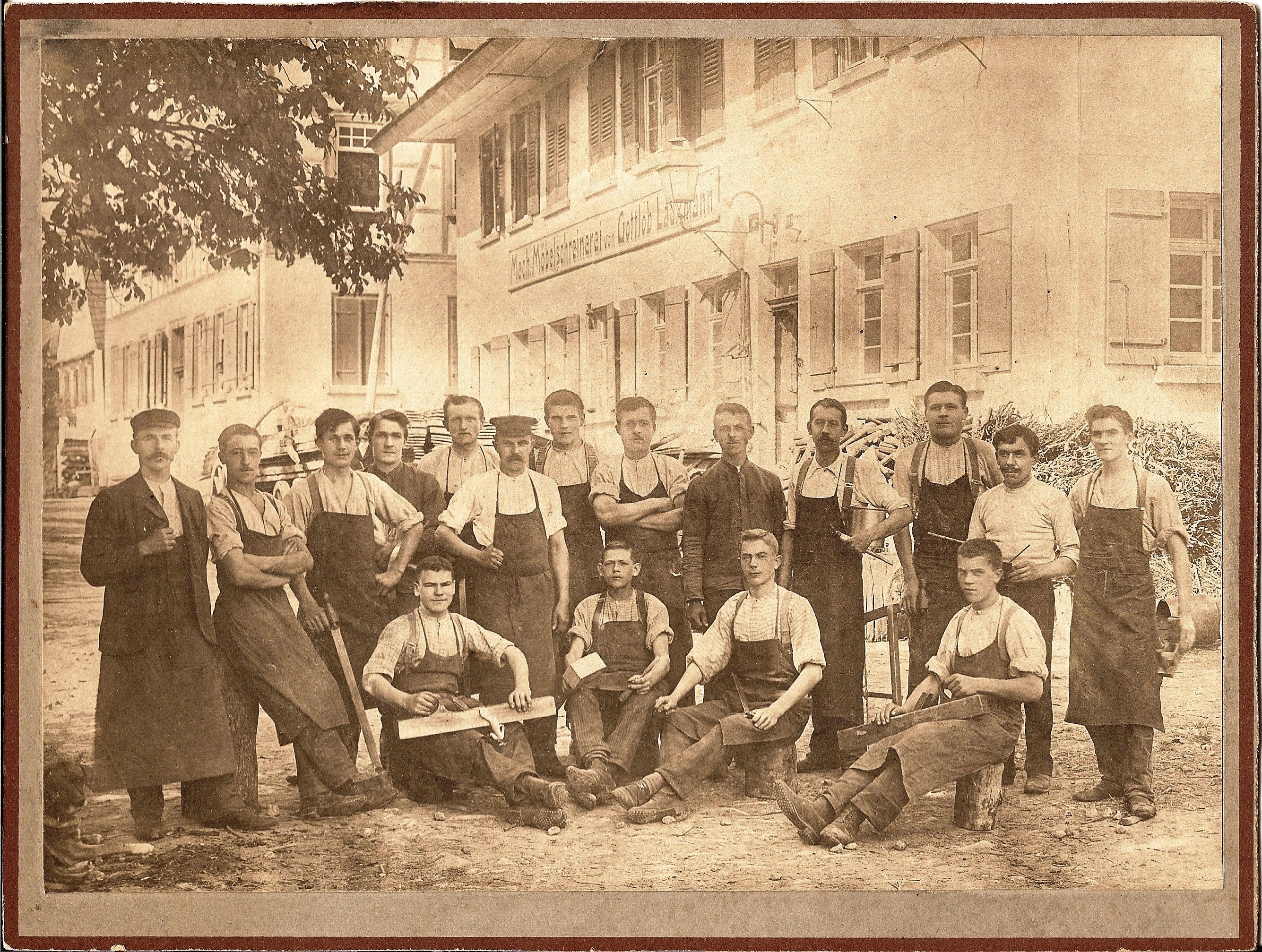 Im Jahre 1938 wurde an das bestehende Werkstattgebäude Altdorfer Strasse 23 ein Anbau mit Maschinenraum und im ersten Stockwerk die Lackier- und Polierabteilung gebaut. Leider mussten mit Kriegsbeginn die Söhne Gottlob und Friedrich Lauxmann sowie der Schwiegersohn Heinrich Lehre, alle Schreinermeister, in den Krieg ziehen.